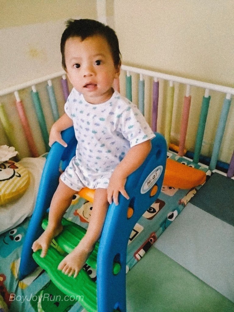 แต่พอพาลงมาเจอคุณยายแล้ว ก็สดใสขึ้น เพราะน่าจะเห็นว่า สไลด์เดอร์ ยังคงอยู่ในคอกของตัวเอง