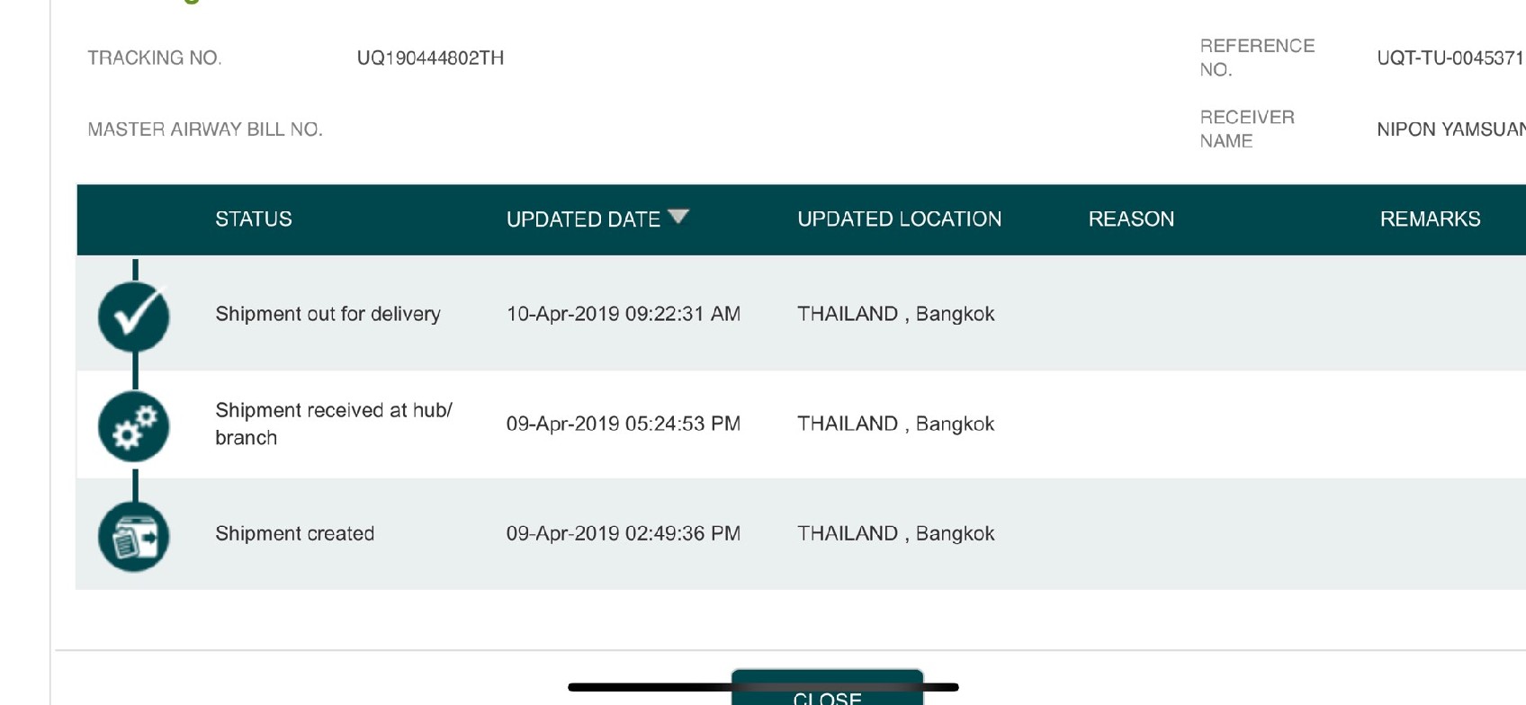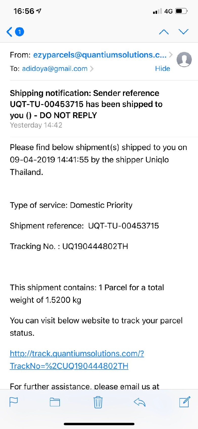 ทำรายการสั่งซื้อสินค้าพร้อมชำระเงินไปเมื่อวันจันทร์ที่ 8 เมษายน เวลา……เที่ยงคืนกว่าๆ (ระบบมองให้เป็น วันอังคารที่ 9 เมษายน เวลา 12.45 AM) และพอเราตื่นมา ระบบก็ส่ง อีเมล ยืนยันรายการสั่งซื้อ แล้วตามมาด้วย อีเมลจาก บริษัท ขนส่งในการแจ้งรายละเอียดการจัดส่งสินค้าดังกล่าว