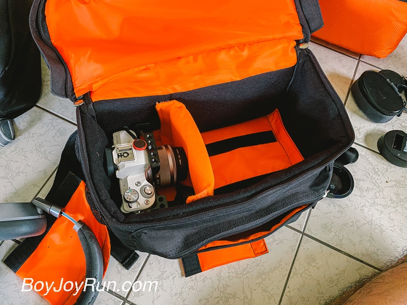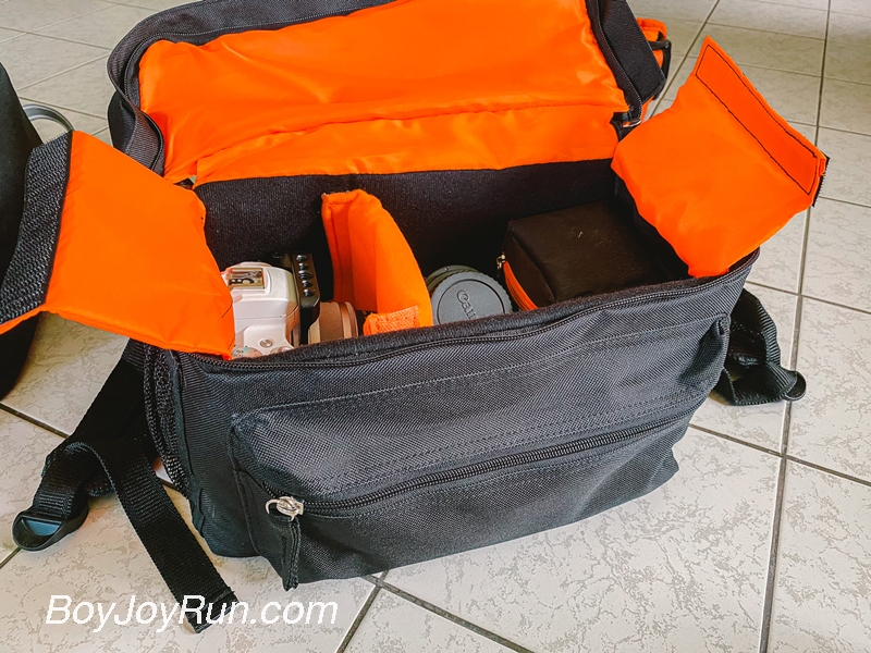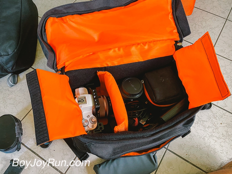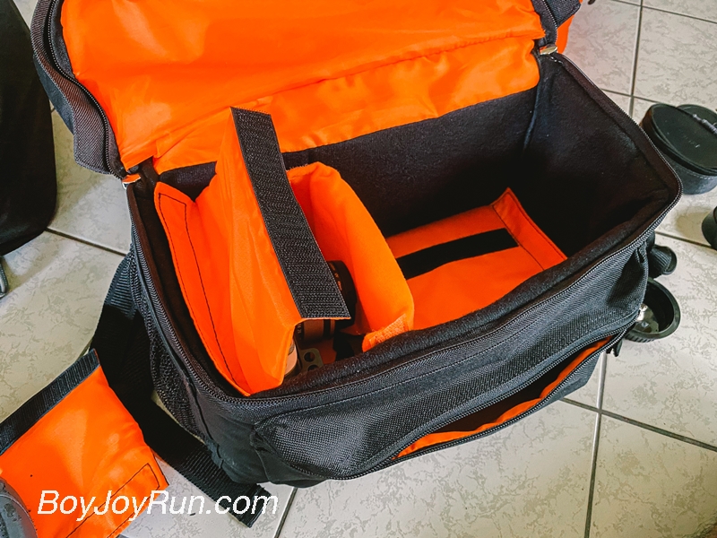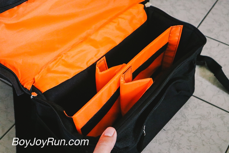 สำหรับ ห้อง (ขอใช้คำว่าห้องเลยนะ ช่องมันจะดูเล็กไป) เก็บกล้องล่างสุดของกระเป๋าใบนี้นั้น ออกแบบ และ ใช้วัสดุ ที่ตากล้องคุ้นเคยกันอยู่แล้ว ทั้งการบุผ้า ที่แบ่งช่องกัน ตีนตุ๊กแก แต่ที่สะใจก็คือ สี … ส้มตัดดำ มันส์สัส สว่างวาบ ดี ชอบแต่ ไอ้แผ่นแบ่งช่อง ผมว่ามัน บางไปนิดนึง แล้วก็ ไอ้แผ่นยาวคั่นกลางอาจทำให้ การแบ่งห้องมันจำกัดไป แต่ไม่เป็นไร ปรับปรุงเปลี่ยนแปลงคือเรื่องถนัด