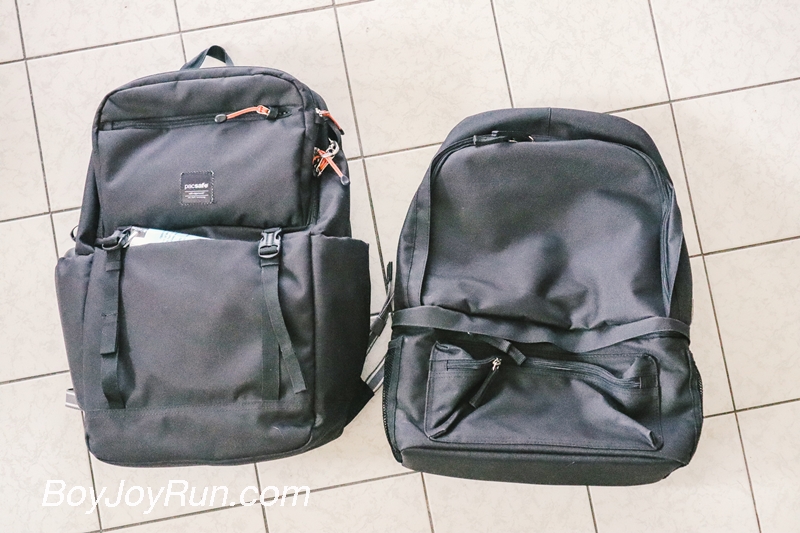 ขนาดรวมๆก็พอกันไม่ค่อยต่างกันเท่าไหร่ วัสดุผ้า ก็เกือบจะคล้ายๆกันเลยนะ แต่ของ EYE มีความรู้สึกส่วนตัวว่า หนา กว่าอาจจะเพราะยังซิงอยู่ไม่ผ่านดินฟ้าอากาศแบบ Pacsafe